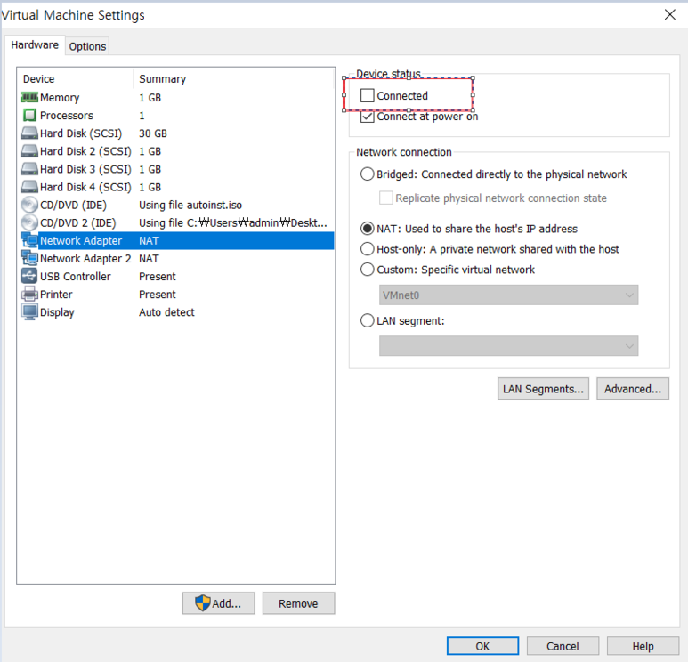 vmware workstation을 통해 고의로 연결을 끊어준다.