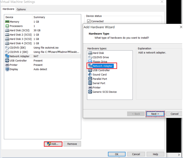 NIC 추가시켜주기 ( 그러면 리눅스 내에서는 ens?? 가 하나 추가될 것이다.)