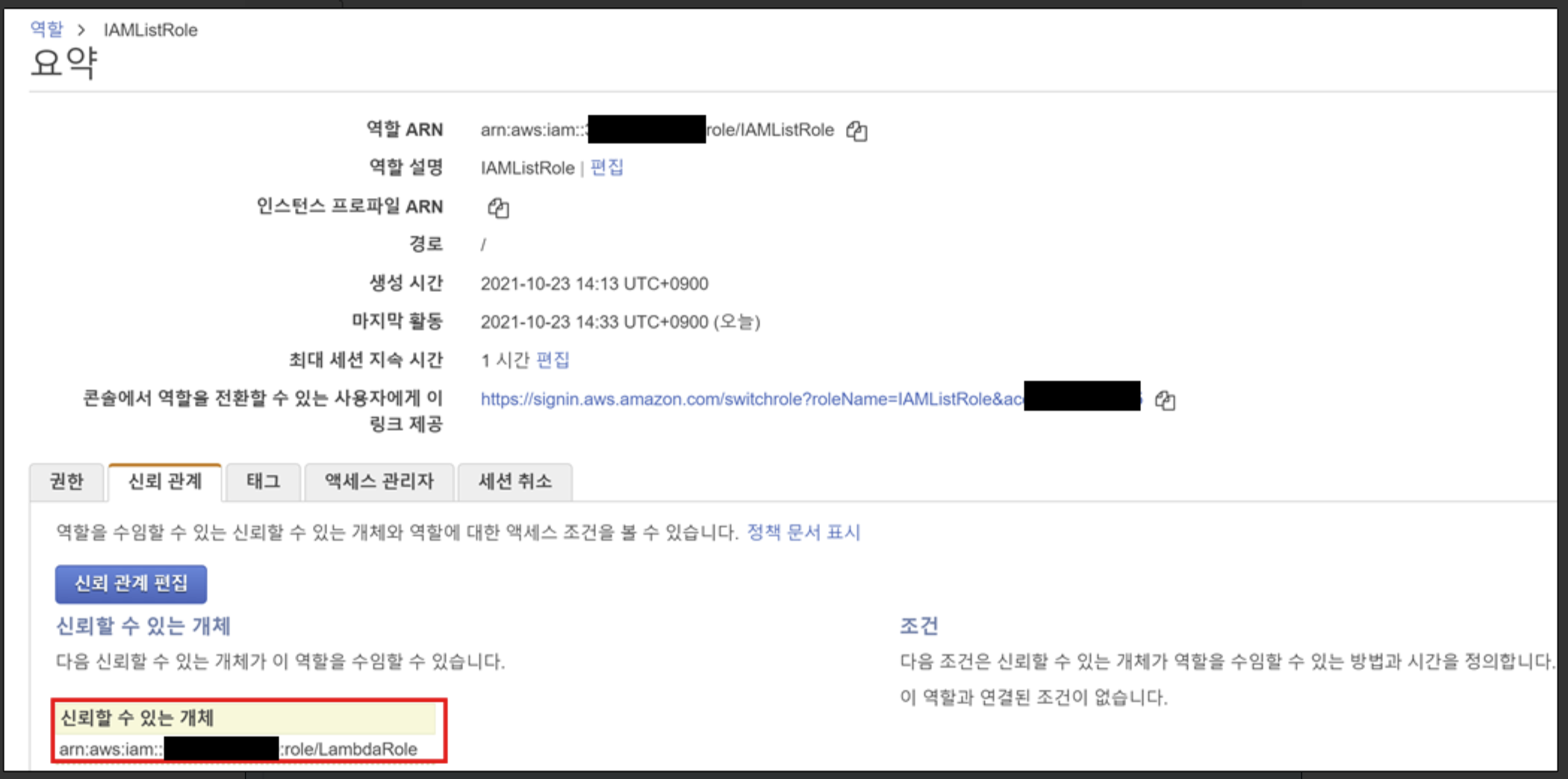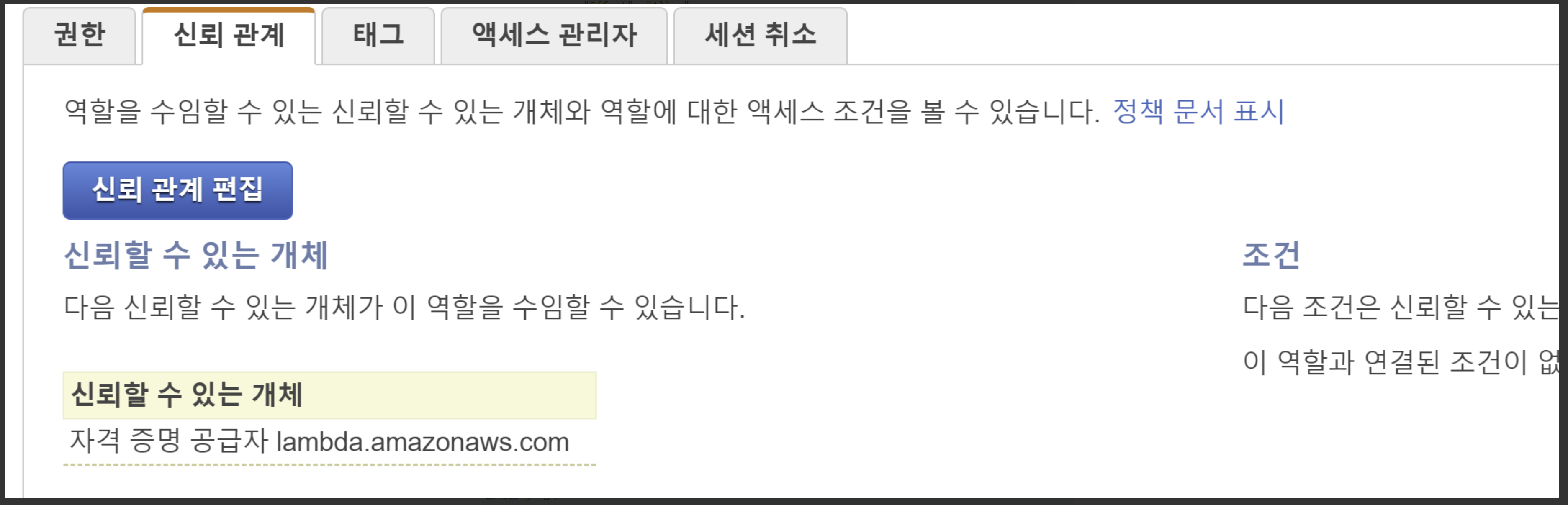 2. 신뢰 관계는 해당 Role은 계정 B에서 Lambda를 수행해야 하기 때문에 lambda를 신뢰한다.