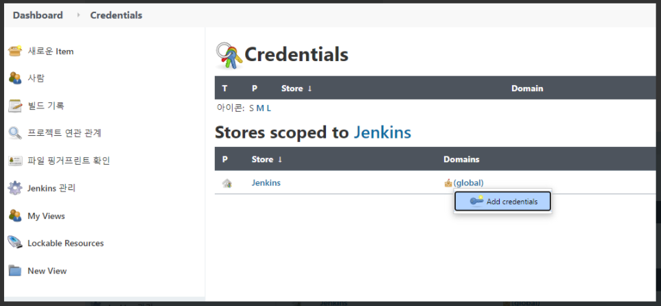 Jenkins → Manage Credentials 클릭 → (global) → Add credentials 클릭