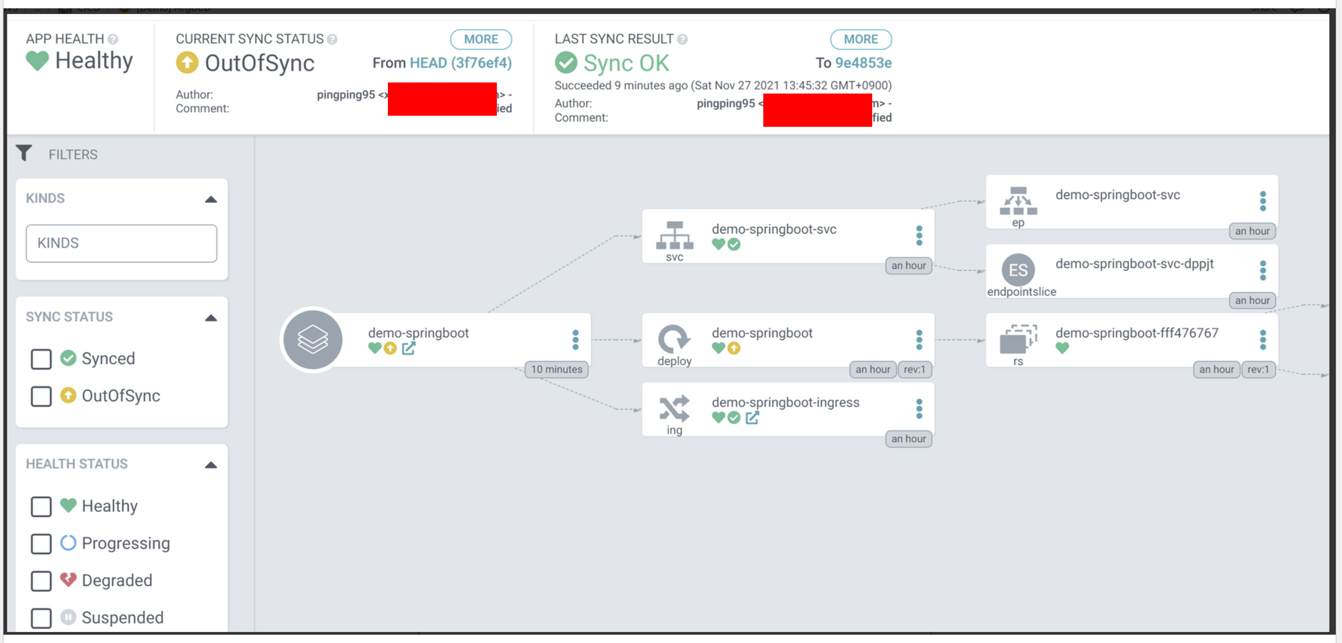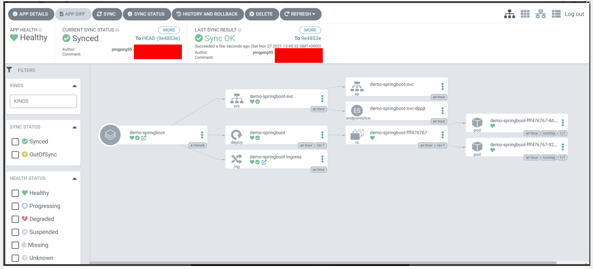 SYNC 수행하게 되면, 아래와 같이 ReplicaSet이 1개 더 생성되며, Pod가 새로 생성 및 Down 된다.