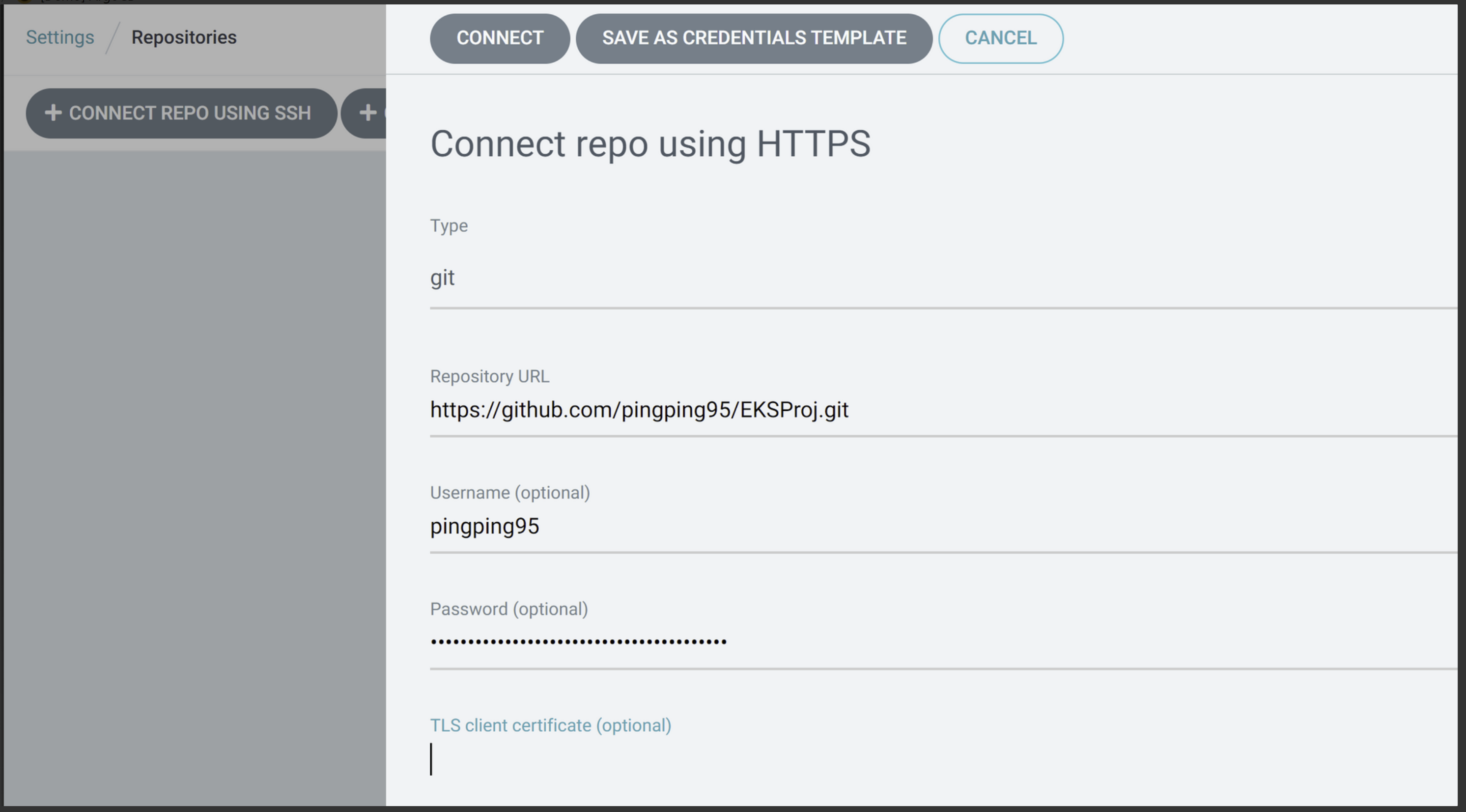 GitOps 형태로 운영할 Repository를 선택하고, Username 그리고 Password (Token)을 기입한다.