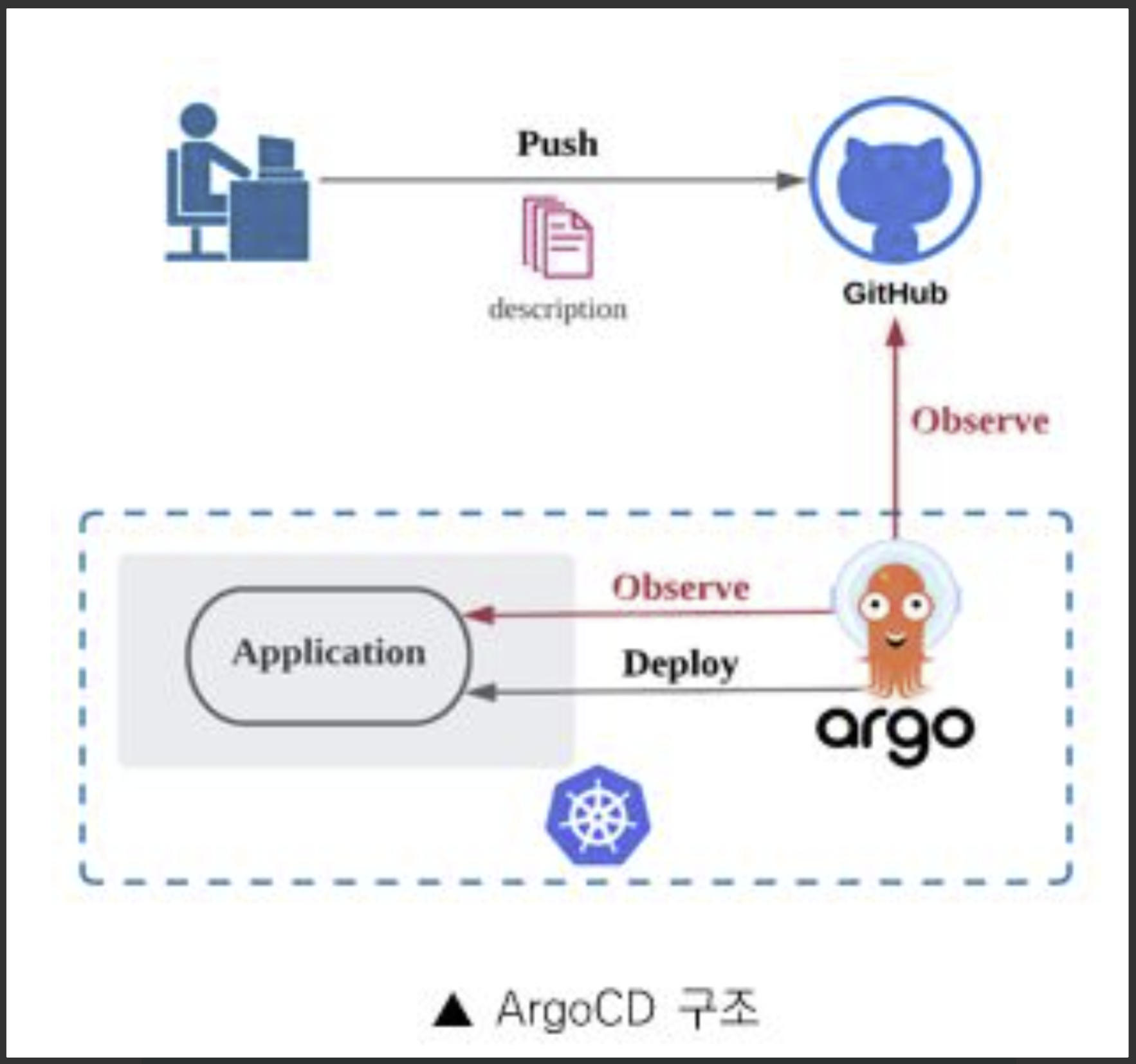 Git Repository (Desired State) <-> ArgoCD <-> Kubernetes Objects (Current State)