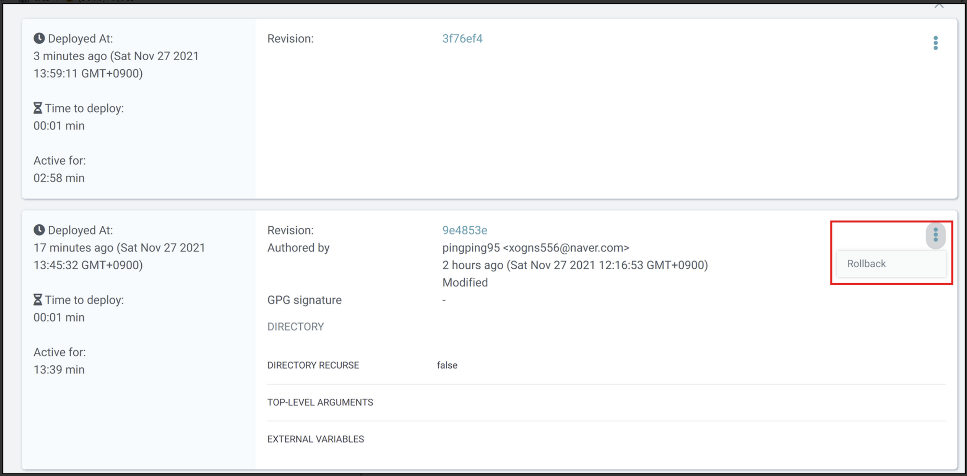 History And Rollback을 클릭하면 이전 배포 내역이 나오며, 원하는 History로 Rollback을 할 수 있다.