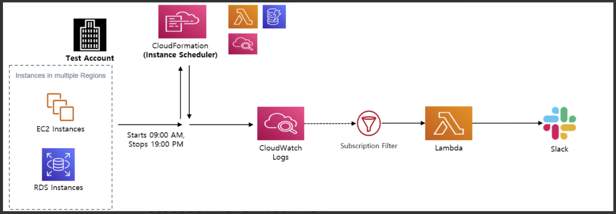 - 인스턴스 스케줄러 : 사전 정의된 시간에 인스턴스를 중지하고 시작하여 EC2 및 RDS의 사용량 및 요금을 줄이고 싶을 때 사용하며, CloudFormation Stack으로 한 번에 배포할 수 있다. 내부적인 동작은 Lambda, DynamoDB, Tag, CloudWatch 등을 통해 동작하게 된다.
