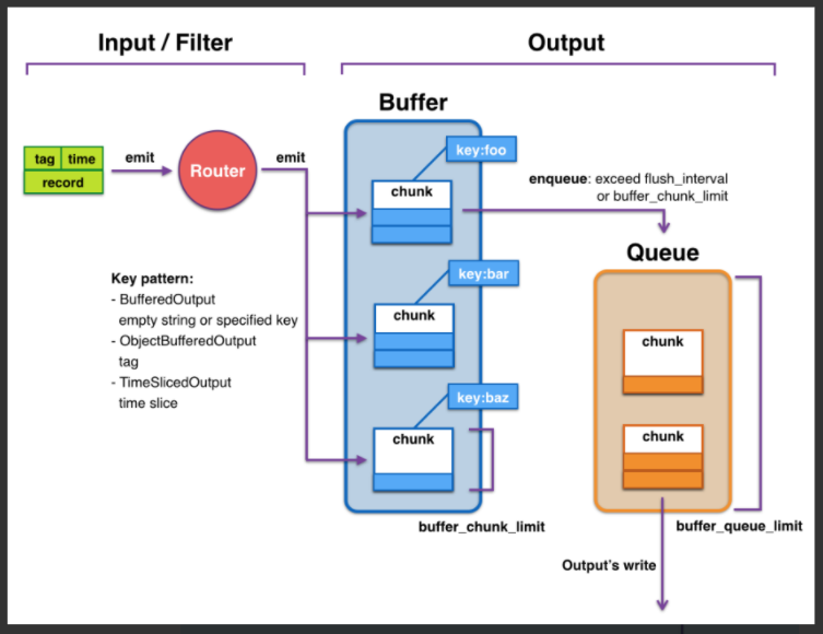 Chunk에 데이터가 쌓여서 buffer_chunk_limit만큼 Chunk가 쌓여서 full이 되거나, 설정값에 의해 정의된 flush_interval 주기가 되면 로그 저장소로 로그를 쓰기 위해서 Queue에 전달이 된다.