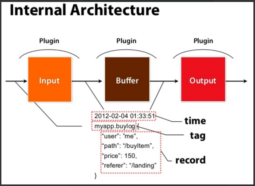 Tag : 데이터의 분류이다. 로그 레코드는 tag를 통해 로그의 종류가 정해지는데, 이 tag에 따라서 로그에 대한 필터링, 라우팅과 같은 플러그인이 적용이 된다.