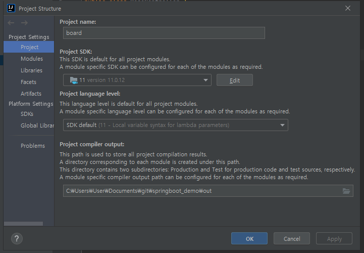 Java 11을 사용하기 위해 'Project Structure -> Project Settings -> Project에서 Prject SDK'를 기 설치해 둔 11을 선택