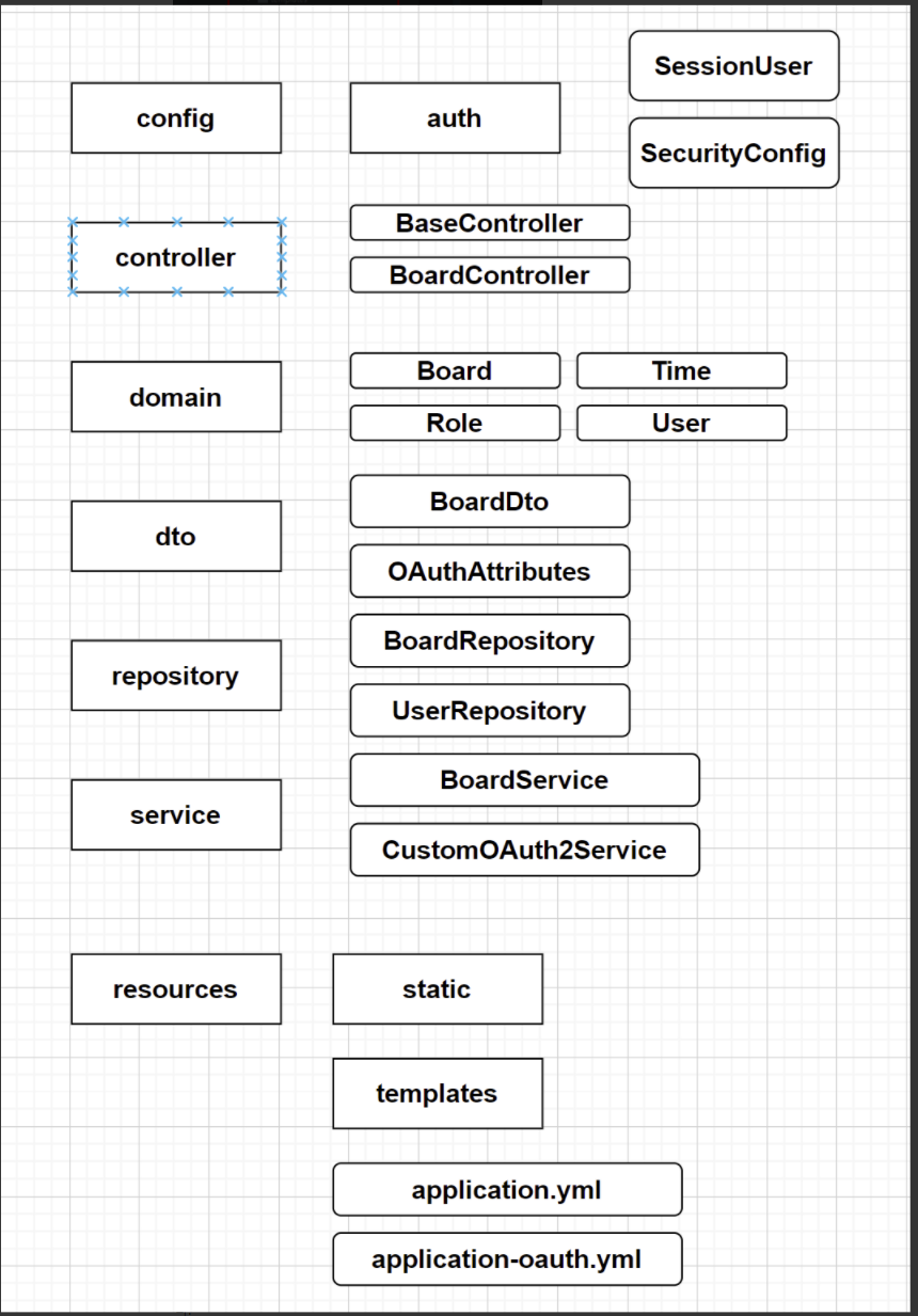 각각 config, controller, domain, dto, repository, service 패키지로 구성이 되며, 각각 패키지 내부에는 class 파일, Enum 파일, Interface 파일 등이 존재하게 된다.