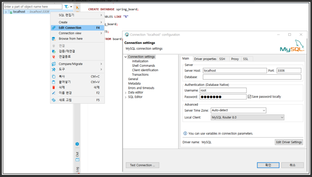 url: jdbc:mysql://localhost:3306/spring_board?serverTimezone=Asia/Seoul&characterEncoding=UTF-8