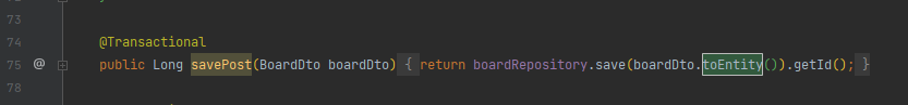 2. toEntity 메서드를 통해 Service -> Database(Entity)로 Data(게시판 글 상세 정보)를 전달할 때 Dto를 통해서 전달한다.