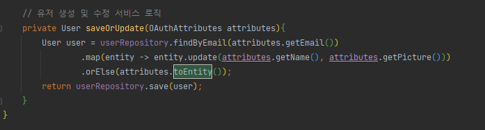 이 또한 OAuthAttributes 클래스의 정적 메서드를 선언하는 부분이다.