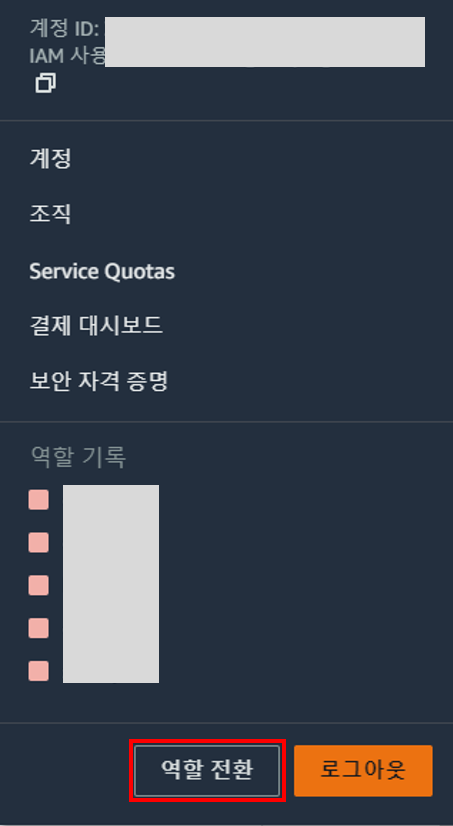 # 3. 역활 전환 페이지에서 '계정', '역할' 기입 후 역할 전환