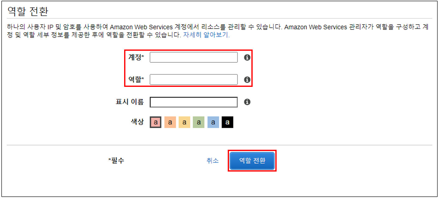 B. 계정명, 역할명을 기입한 뒤 역할 전환 클릭