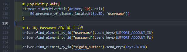 3. Explicitly Wait으로 특정 Element가 나올때까지 대기한 뒤 username id가 있는 element가 보일 경우 ID, Password를 기입 후 로그인