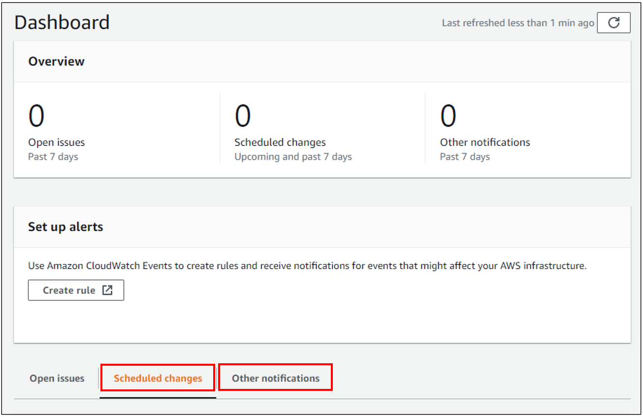 [1] AWS PHD(Personal Health Dashboard)에서는 하드웨어 메인터넌스 및 VPN 싱글 터널 알림, 보안 패치 등에 대한 내용을 알려준다.
