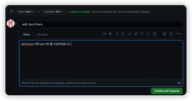 Atlantis는 Git에서 PR 기반으로 협업을 하기 위해 사용하는 Terraform Runner이기 때문에 Main Branch로 바로 Push 하는 것이 아닌 다른 Branch에서 Push한 뒤 Pull Request를 수행해야 한다.