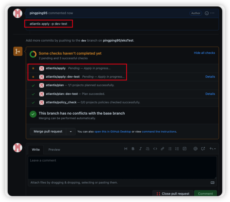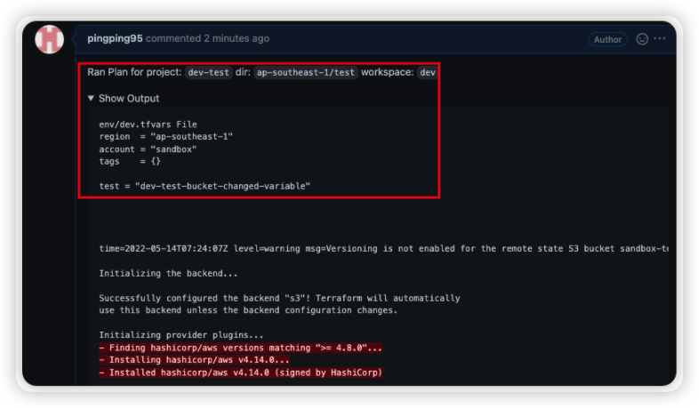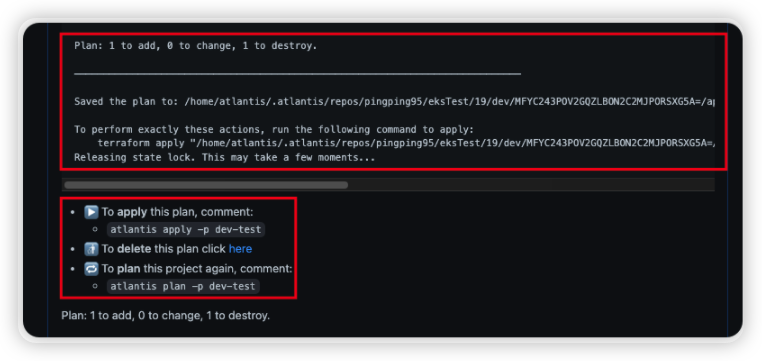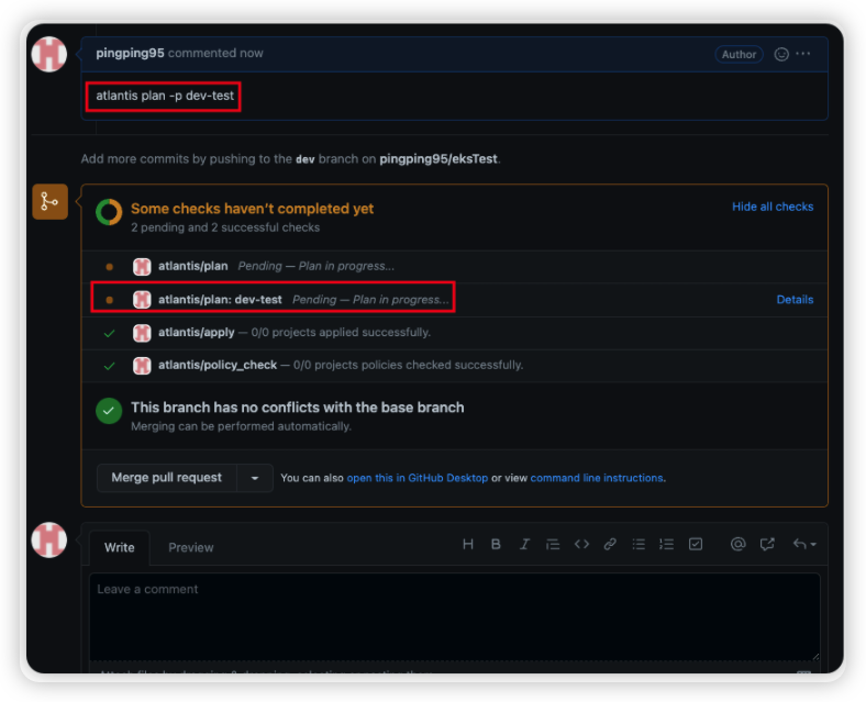 7. Comment에 atlantis plan -p dev-test 명령어를 날리게 되면 Atlantis 서버로 WebHook이 전달되며, Atlantis 서버에서 대신 Terraform을 수행하게 된다.