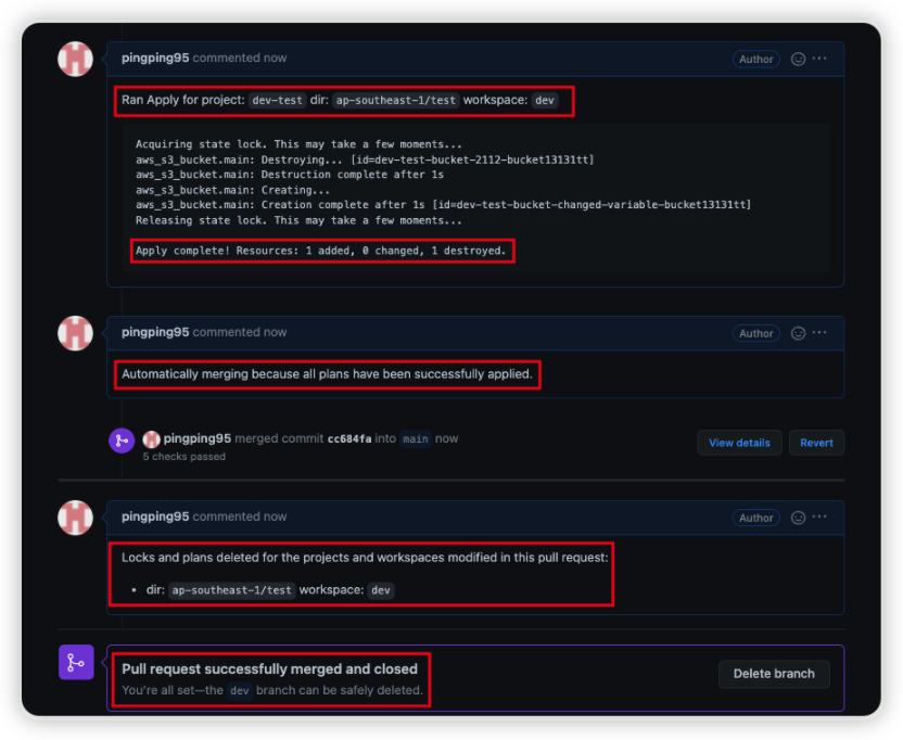 9. Apply 수행된 내역이 출력되며 자동으로 Main Branch에 Merge가 되며 Lock 또한 풀리며 자동으로 Pull Request가 Close 된다.