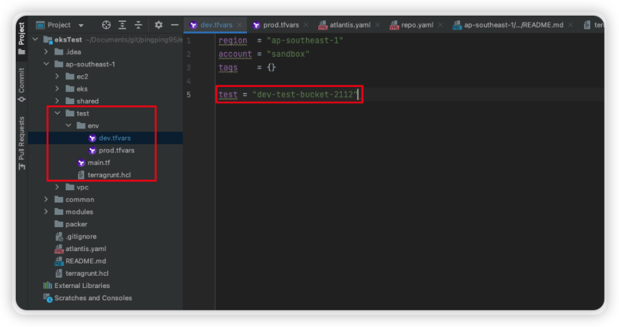 1. ap-southeast-1/test 폴더에서 개발계와 운영계를 각각 dev.tfvars, prod.tfvars로 구분하였다.