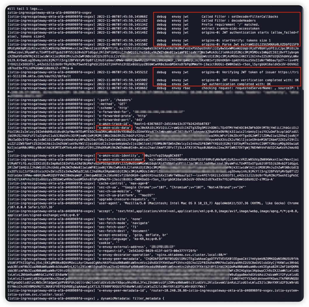 JWT 쪽 Debug 로그를 확인해보면 x-amzn-oidc-accesstoken을 추출하고 JWT token이 Verify 된 것을 확인할 수 있다.