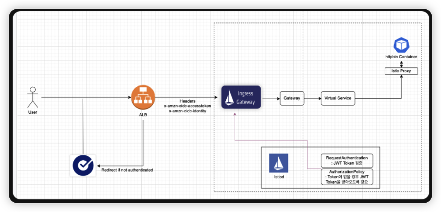Okta에서 인증이 정상적으로 수행되면 Istio Ingress Gateway로 전달되고 Ingress Gateway에서 Authentication, Authorization을 수행하게 된다.