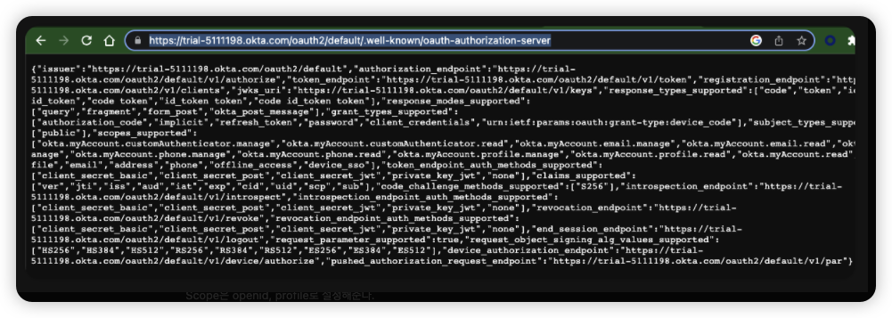 https://XXXXX.okta.com/oauth2/default/.well-known/oauth-authorization-server 로 접근하면 Issuer 등에 대한 정보를 확인할 수 있다.