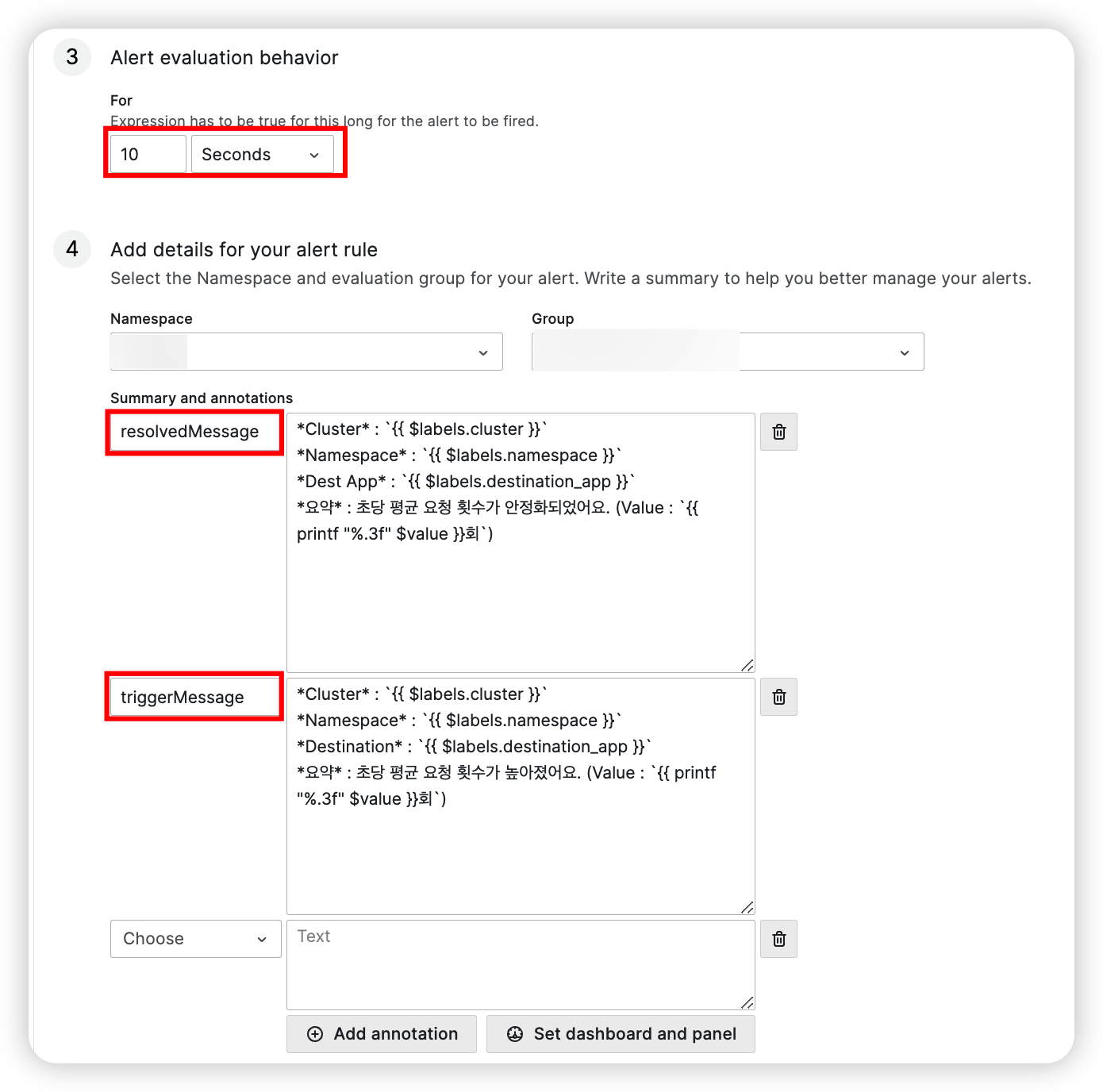 - Alerts.Firing , Alerts.Resolved를 나누어 반복문을 돌면서 기 Ruler에서 정의한 Annotations.(trigger|resolved)Message를 보여주기 위해 아래와 같이 설정하였다.