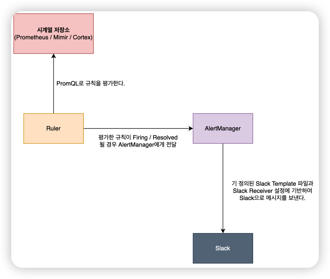 필자는 Grafana Mimir를 통해 시계열 메트릭을 저장하기에 Mimir Ruler를 통해 규칙을 평가하고, AlertManager에게 이를 전달하여 Slack으로 알람을 보내도록 할 것이다.