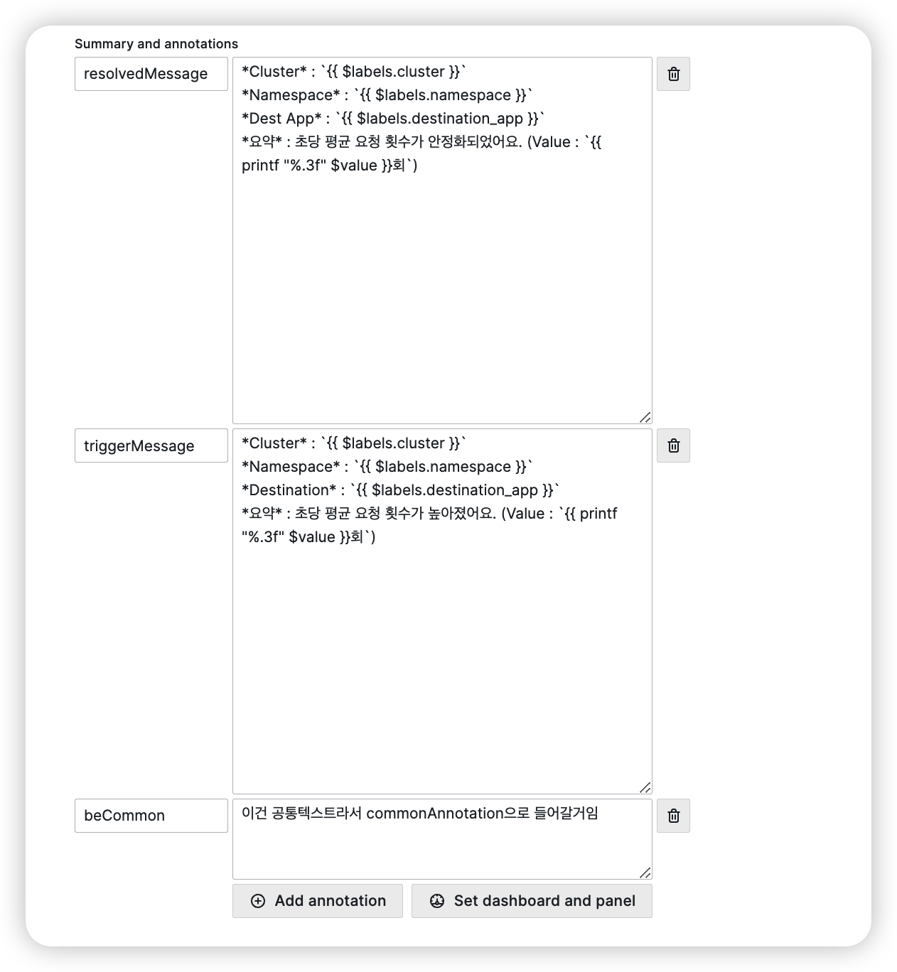 resolvedMessage와 triggerMessage는 각 Alert마다 다른 값이 들어갈 것이므로 CommonAnnotation으로 들어가지 않지만 beCommon이란 어노테이션은 공통 텍스트이기 때문에 CommonAnnotation으로부터 이 값을 사용할 수 있을 것이다.