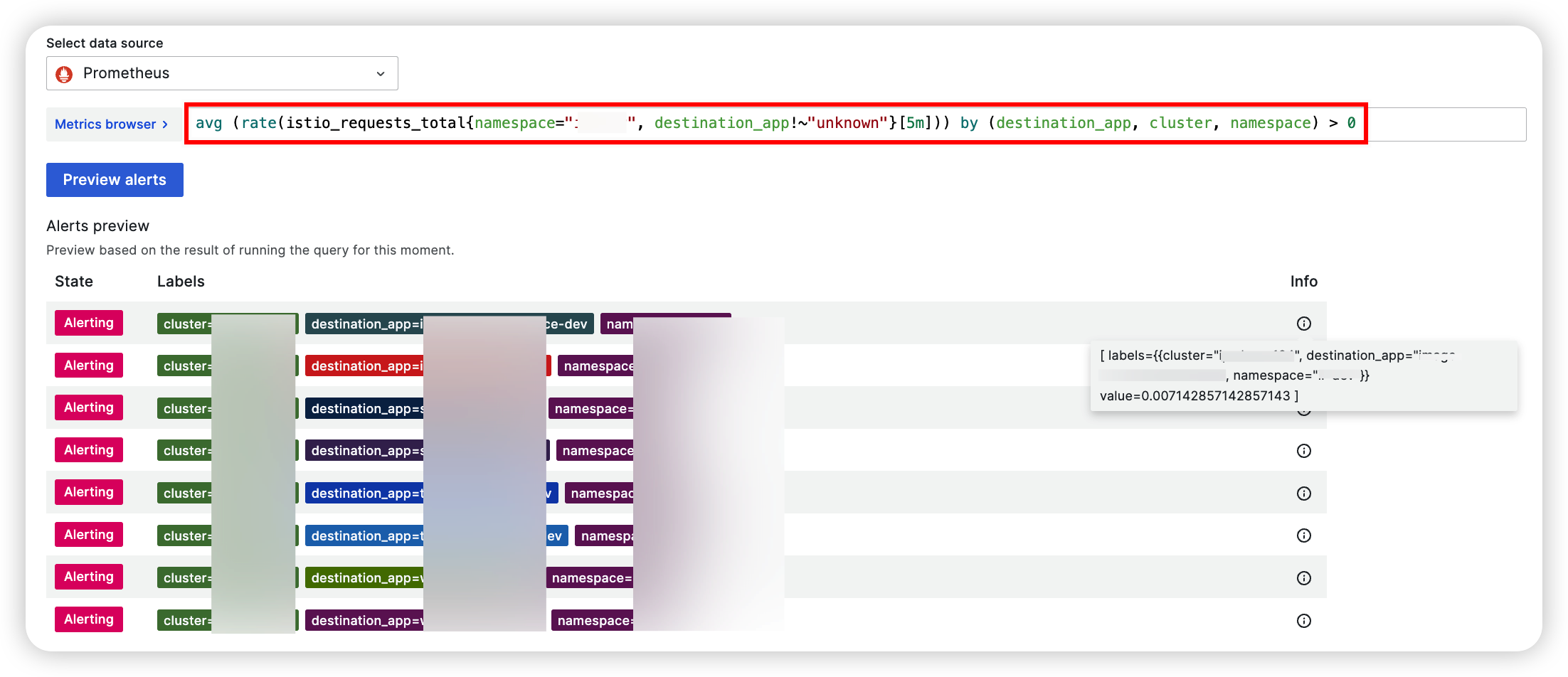 Cluster : `$lables.cluster`