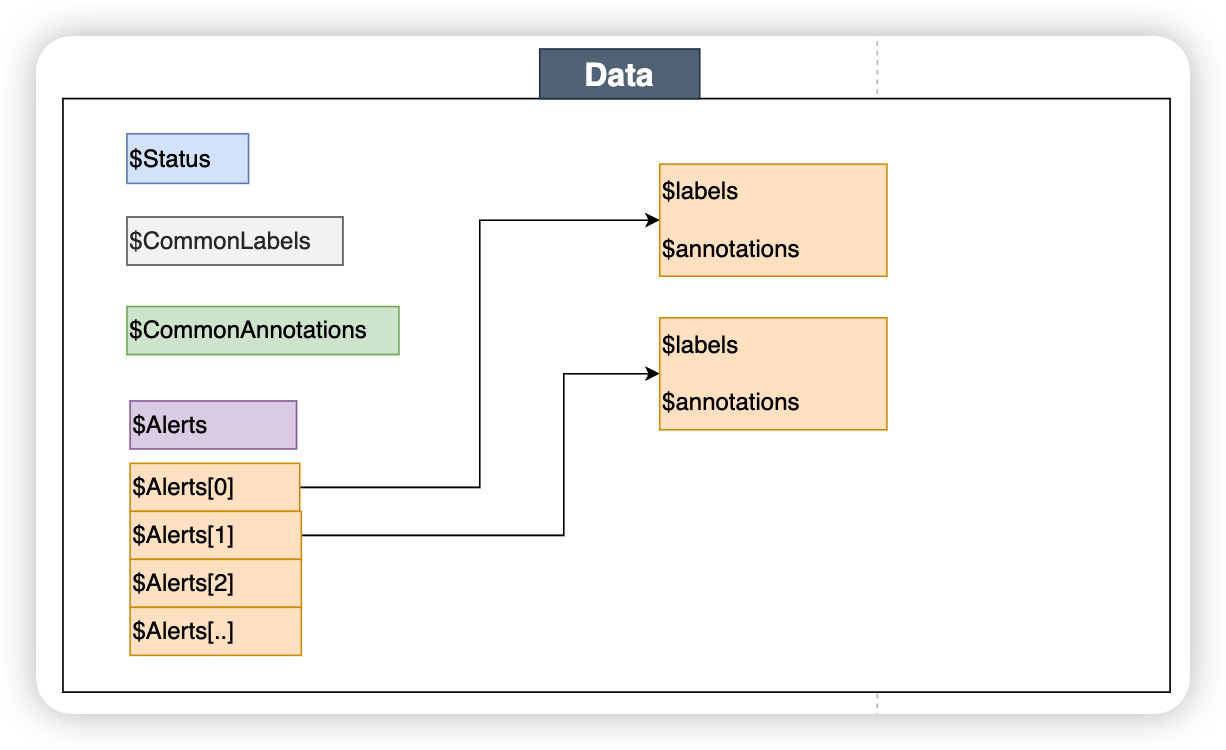 주로 쓰이는 데이터들은 Status , Alerts , Alerts.Firing / Resolved , CommonAnnotations , CommonLabels 등이 있다.