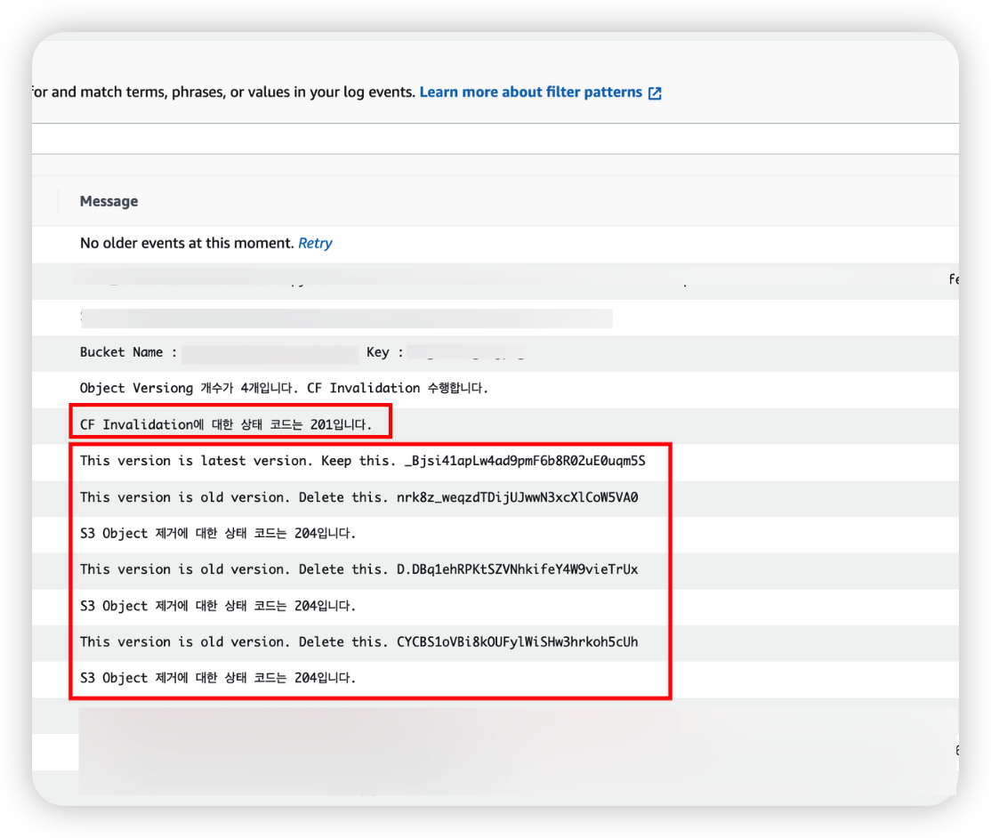Lambda 로그를 보면 오래된 객체만 제거하고 최신 이미지 객체만 유지하는것 또한 확인할 수 있다.