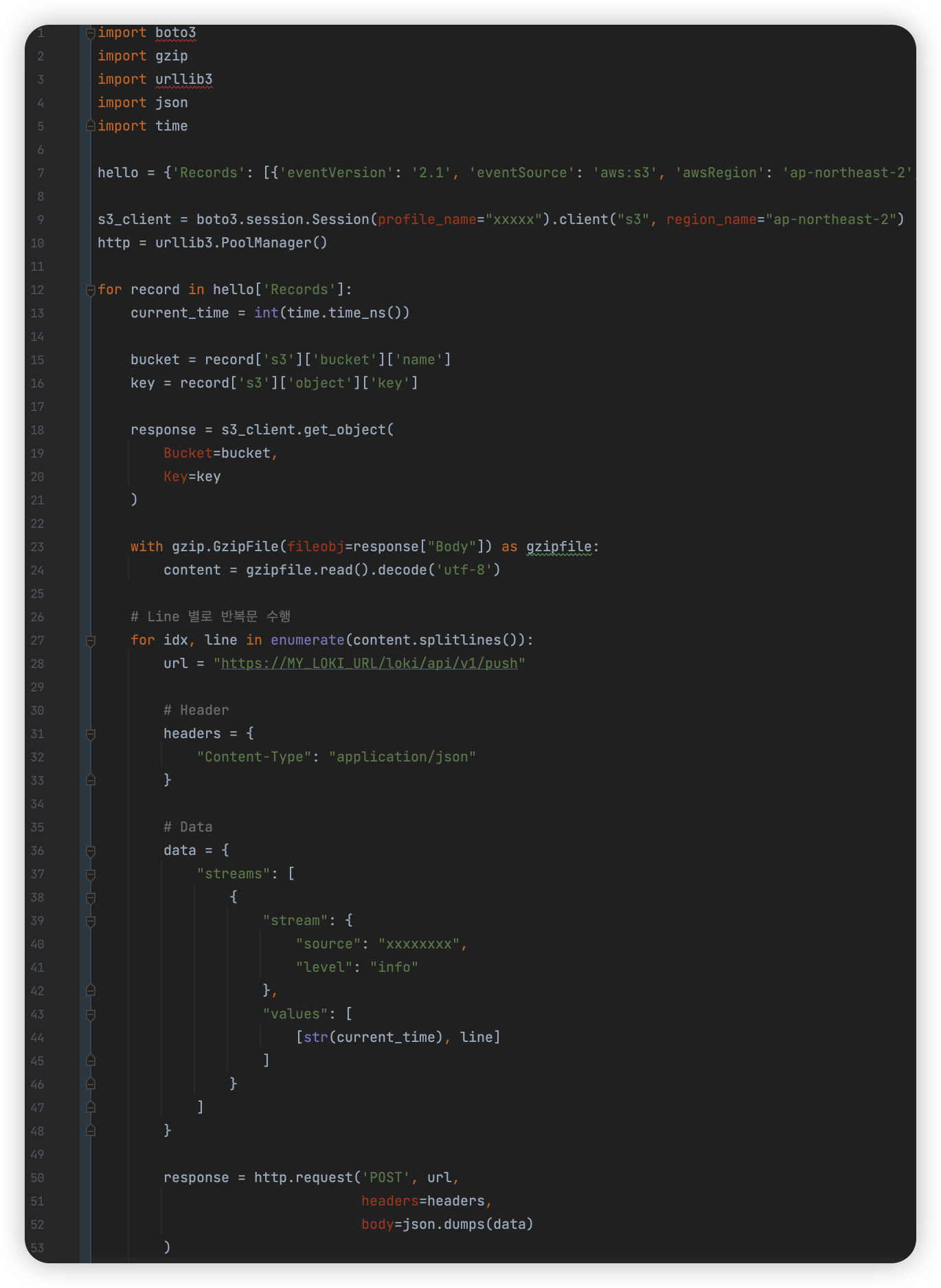 위 예시는 S3에 Object가 생성될 경우 Lambda에서 S3로부터 event를 전달받아 파싱한 뒤 각 Line을 반복문 돌아서 Loki로 전송하는 예시이다.