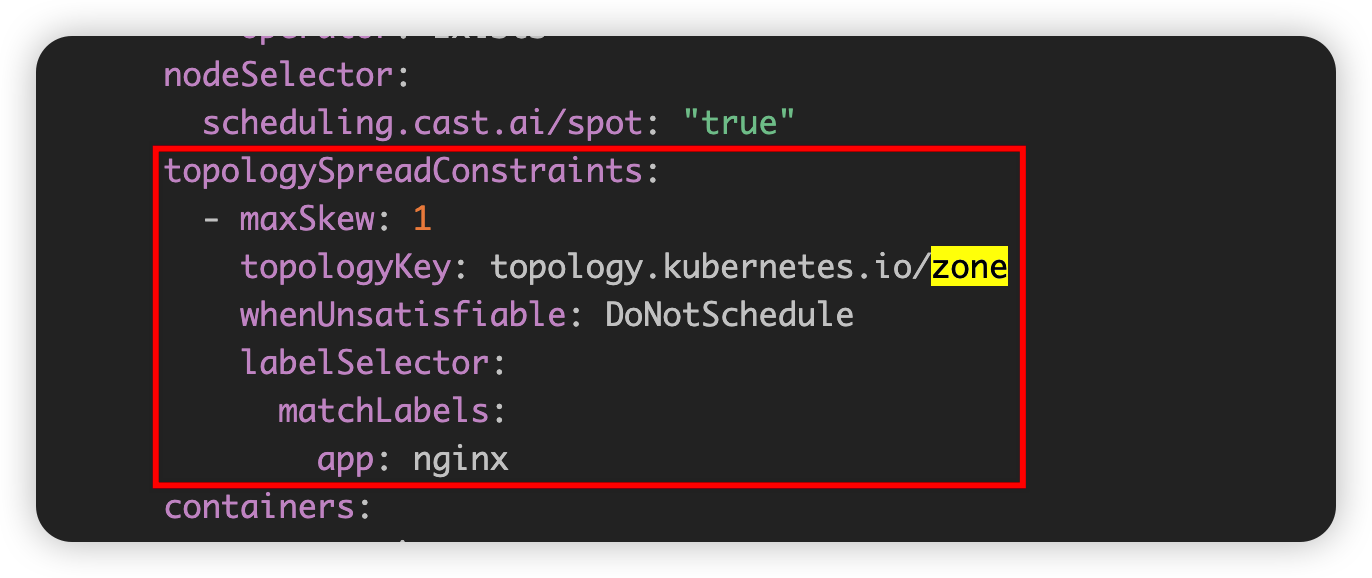 Topology Spread Constraints는 DoNotSchedule (충족되지 않을 경우 Pod를 Pending state로 만들기) , zone 설정을 추가해줬다.