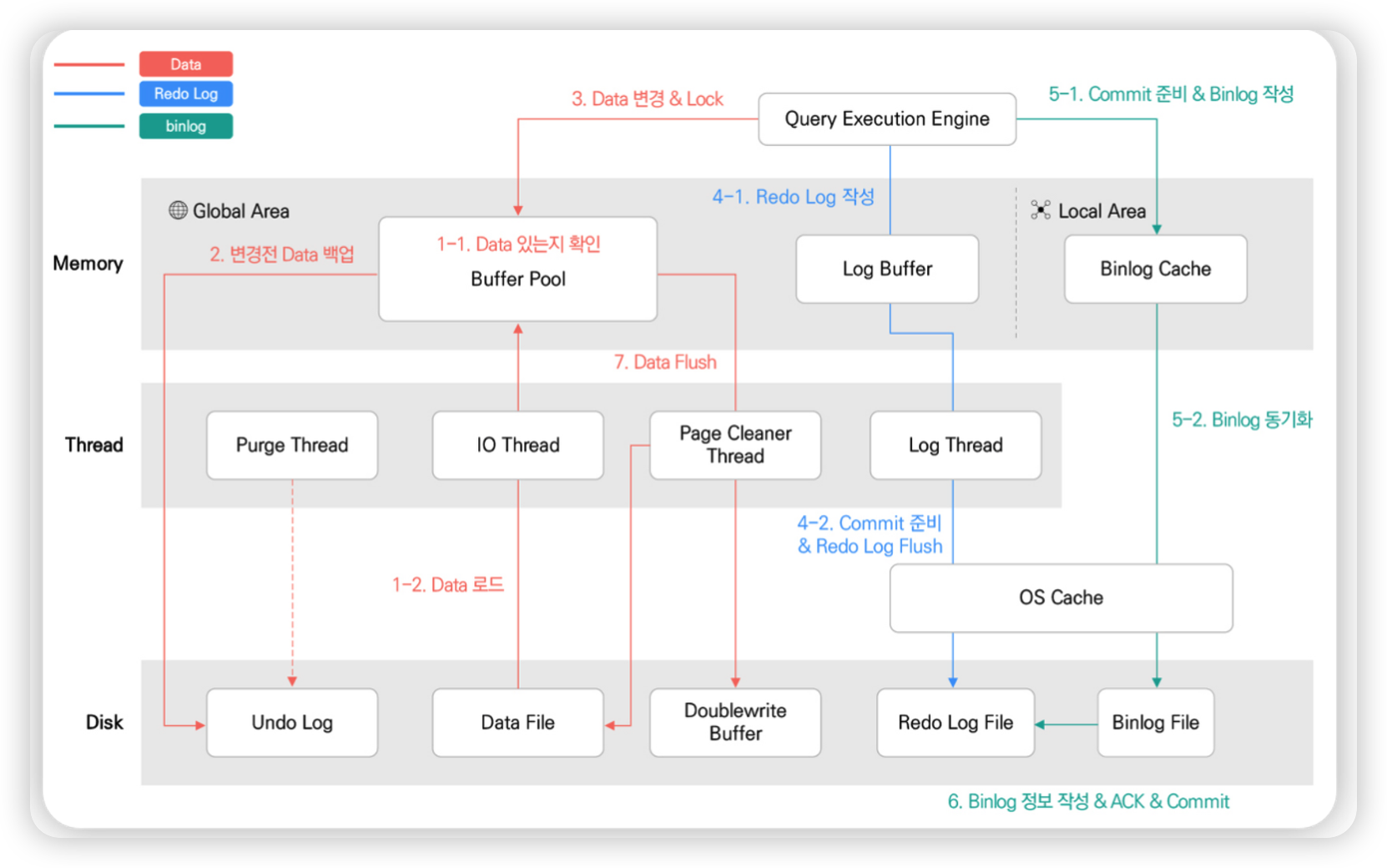 아래는위에서 설명한 내용들을 기반으로 InnoDB가 어떻게 일을 하는지 간단히 정리된 그림이다.