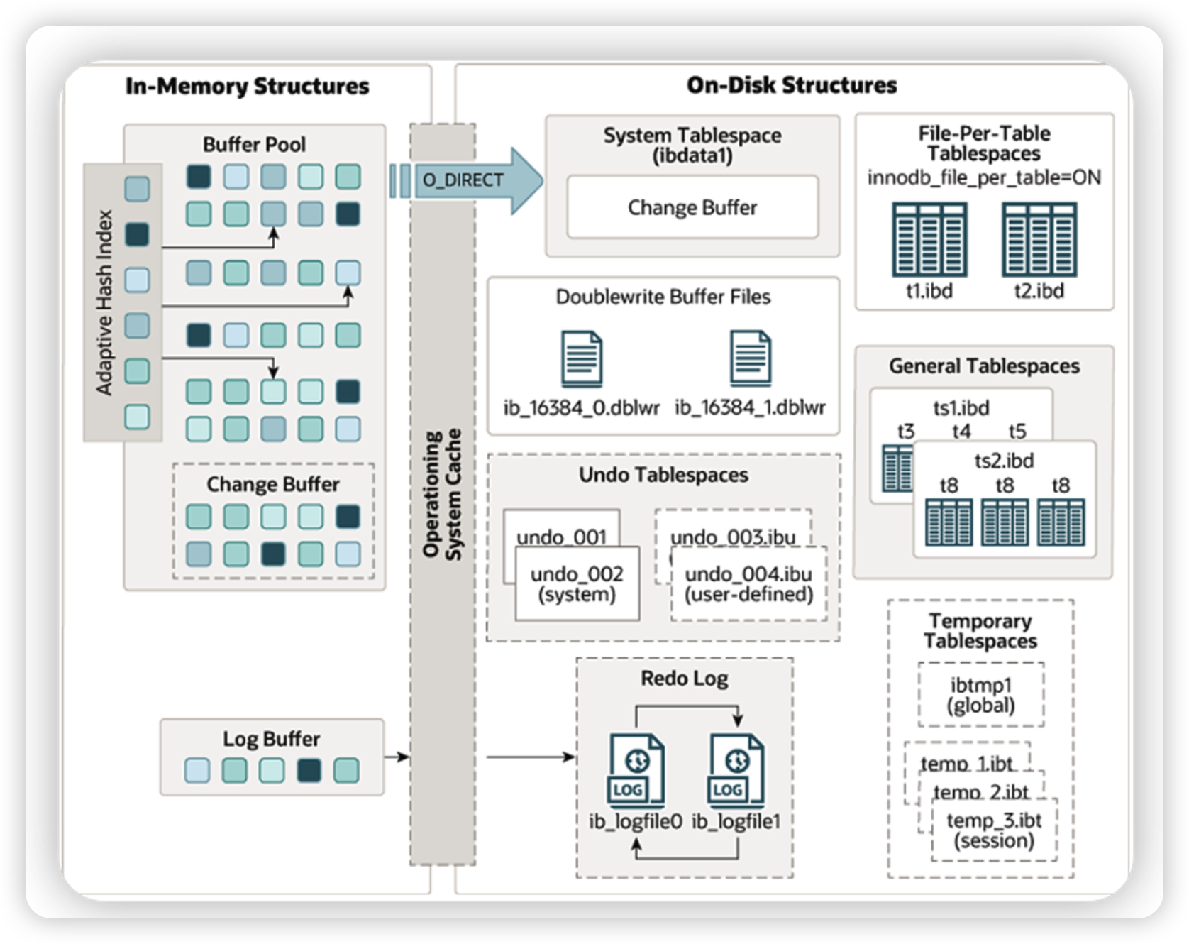- Undo Tablespaces는 변경 전 데이터를 저장하여 롤백 및 읽기에 대해 일관성을 보장하고 독립된 tablespace 파일에 저장한다