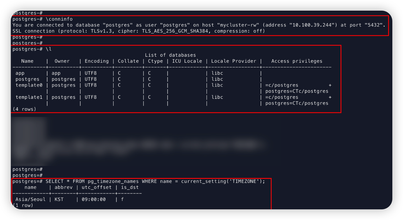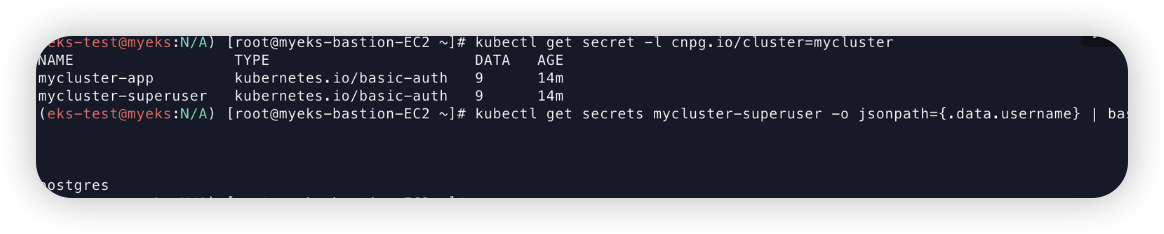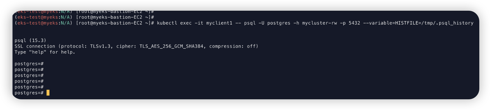 kubectl exec -it myclient1 -- psql -U postgres -h mycluster-rw -p 5432 --variable=HISTFILE=/tmp/.psql_history
