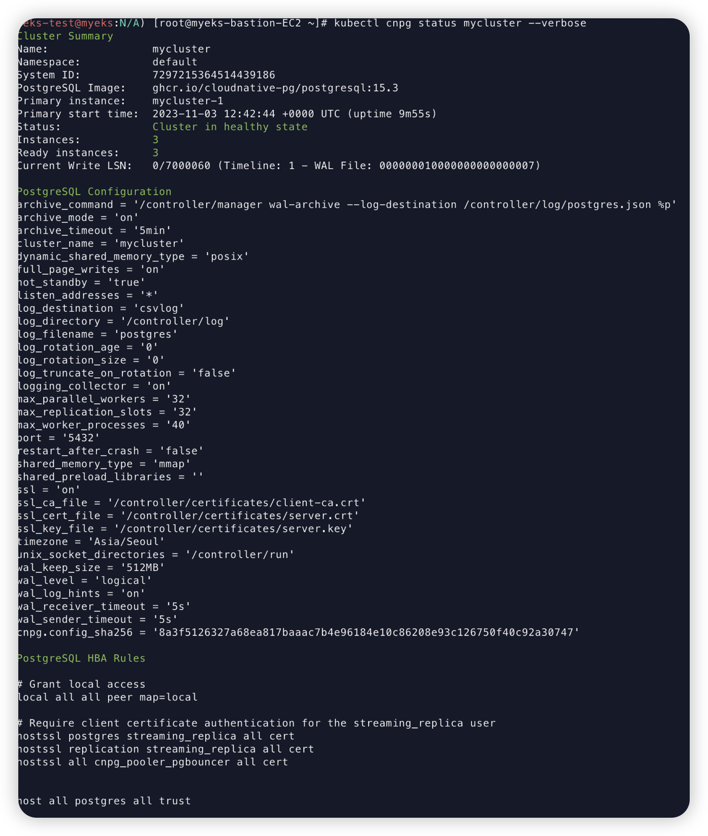 kubectl cnpg status mycluster --verbose