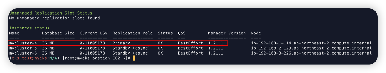 mycluster-4가 Primary로 승격되었음을 확인할 수 있다.