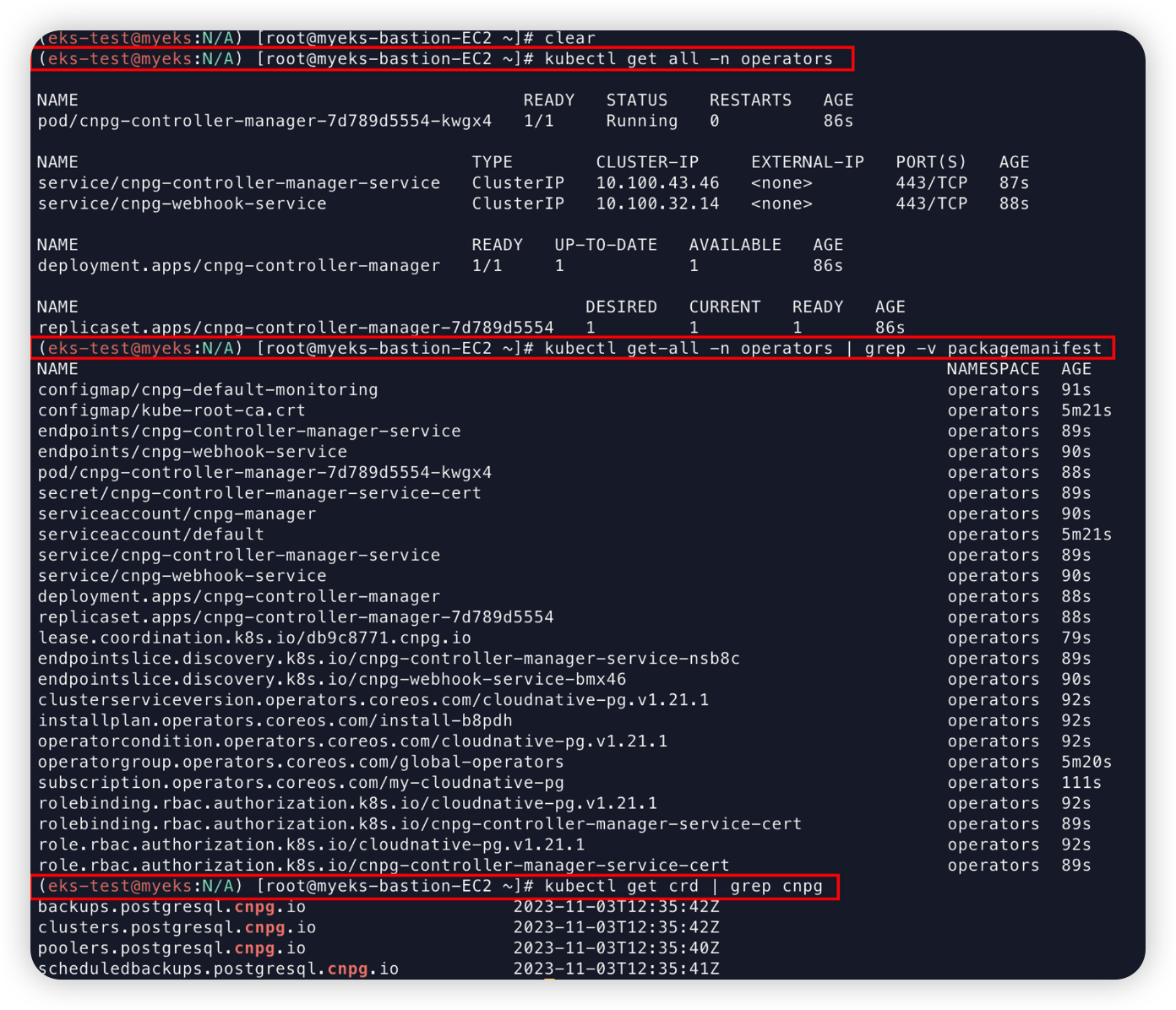 operator 네임스페이스에 cnpg-controller-manager 파드가 설치된 것을 확인할 수 있다.