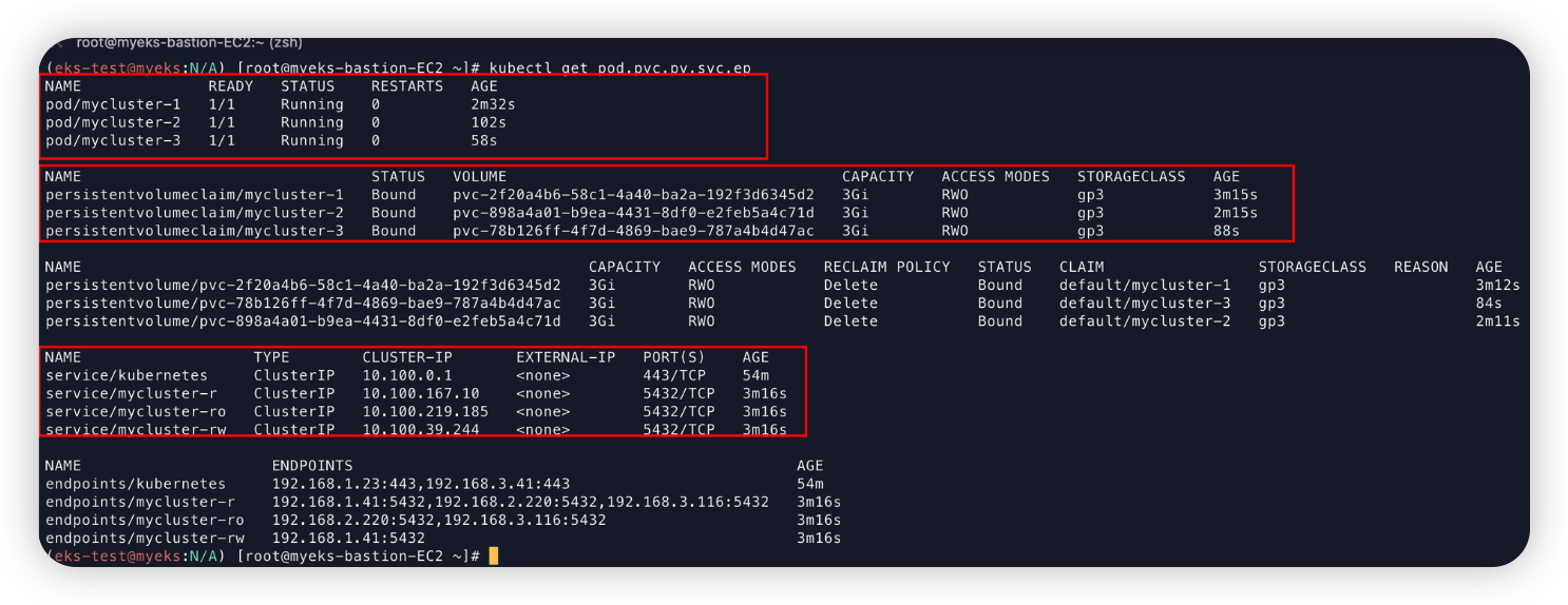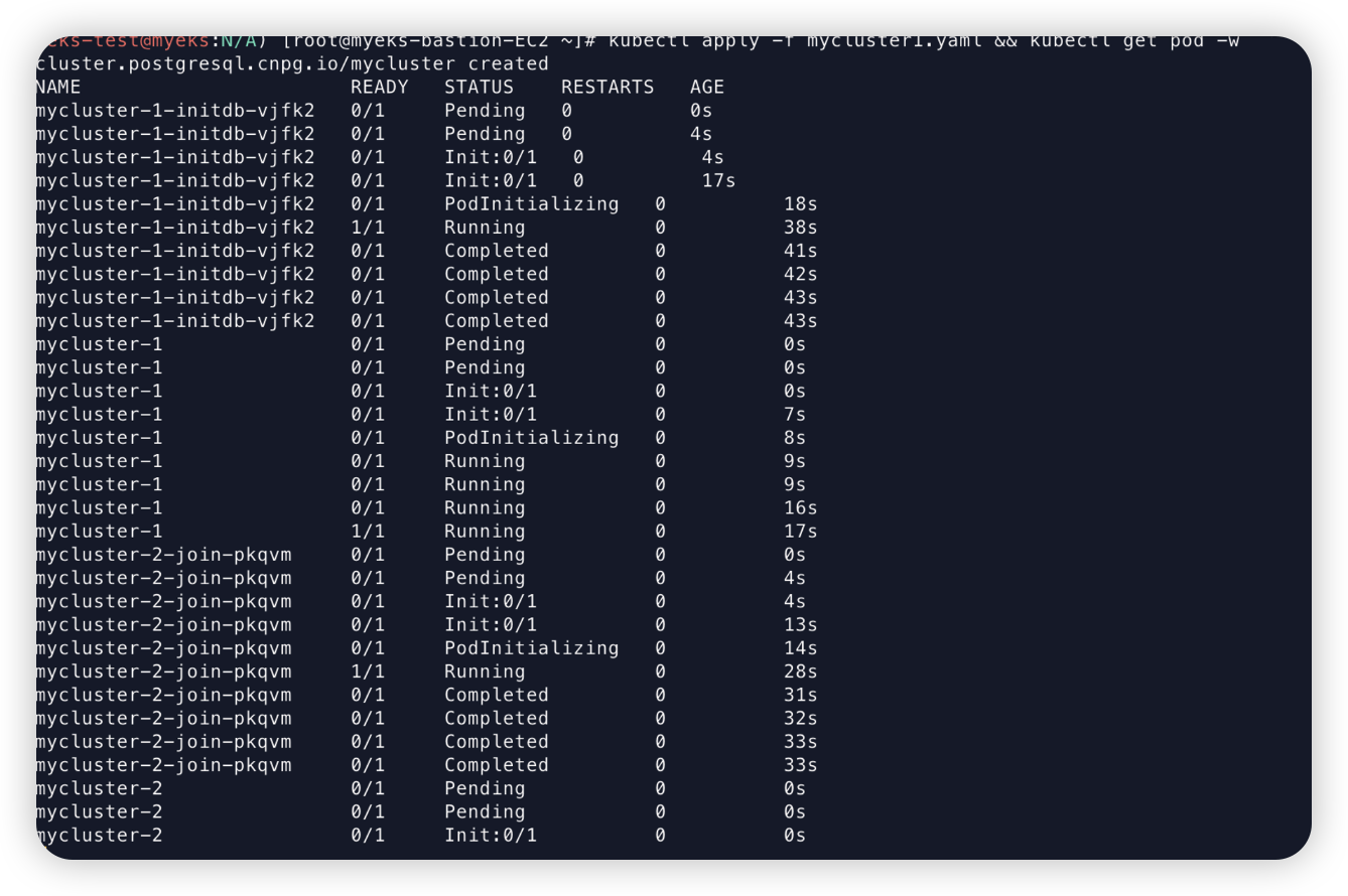 1번 파드에서 Initializing(초기화)를 담당하는 Job이 뜬 뒤 종료되고 mycluster-1 파드가 생성된다.