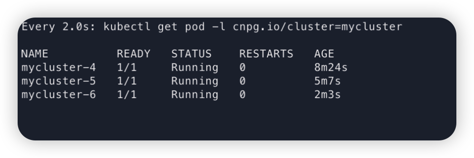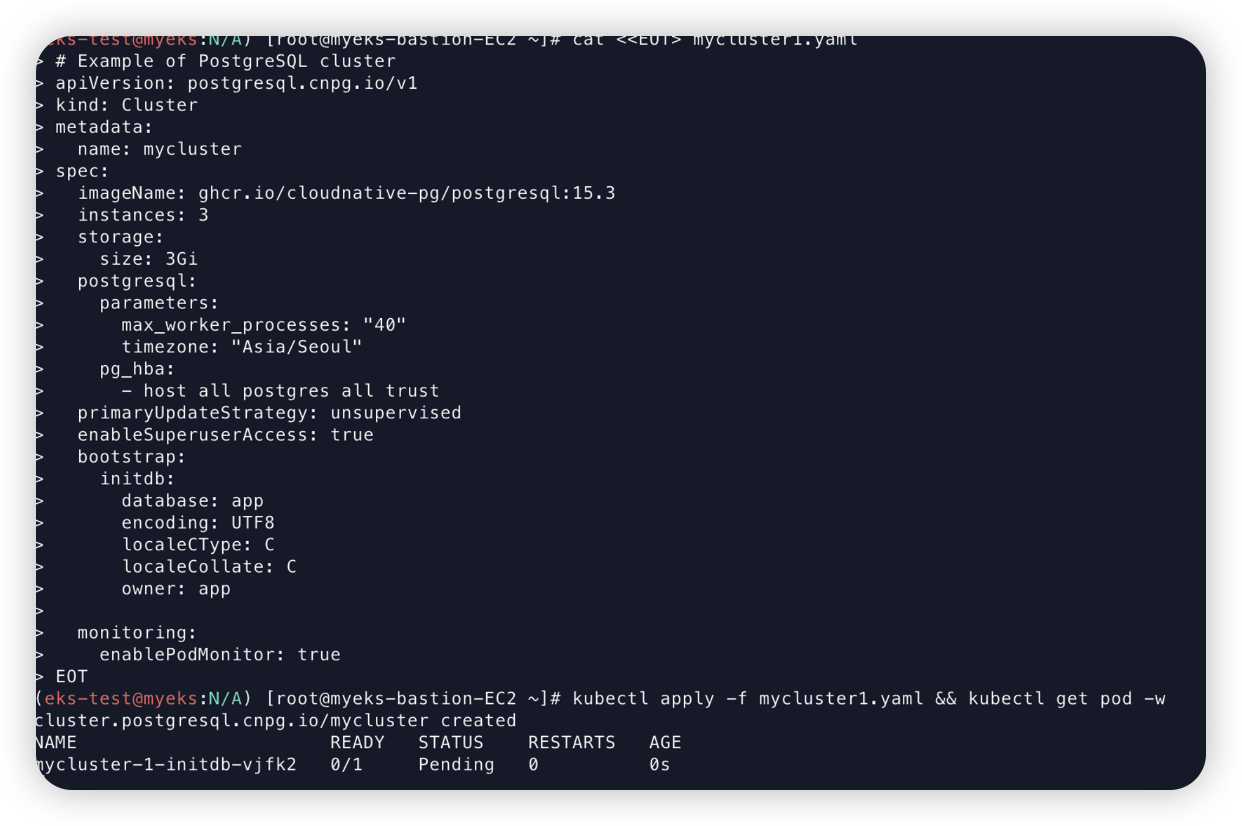 Cluster CR을 바라보고 이제 CloudNativePG가 이를 바라보고있다가 파드를 알아서 생성해준다..