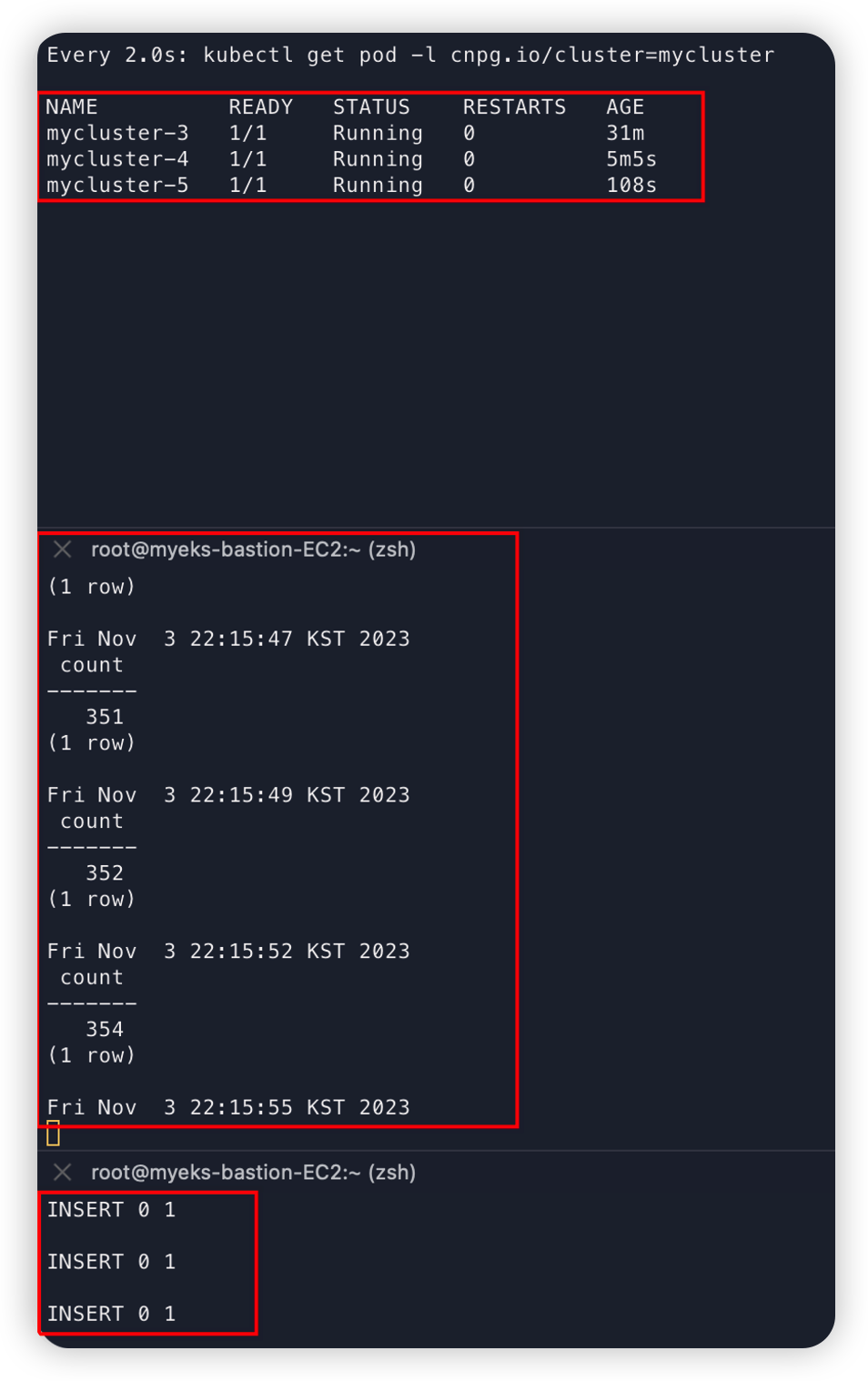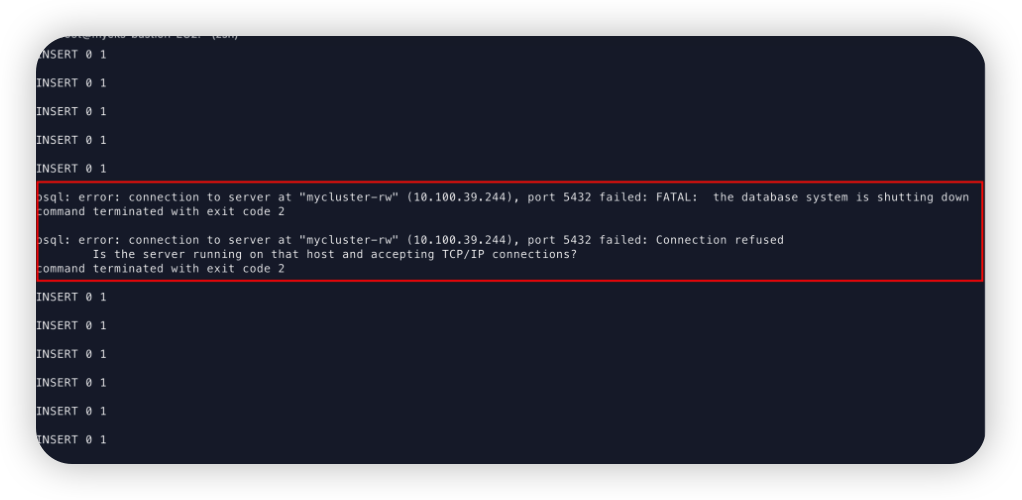 또한 간단한 Failover 테스트를 수행하여 Primary 파드가 죽었을 때 INSERT Query가 어떻게 수행되는지까지 확인해보았다.