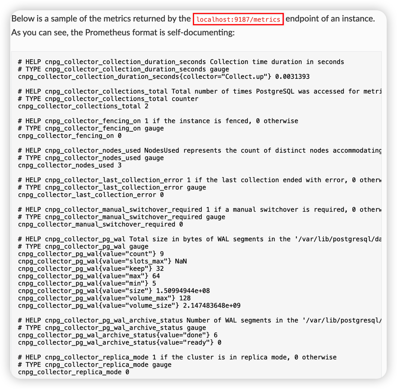 CloudNativePG는 Prometheus 호환 Metric을 9187 Port를 통해 제공한다.