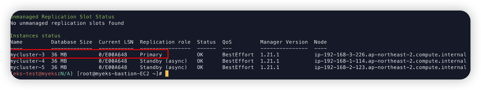mycluster-3 파드가 현재 Primary 노드이기 때문에 mycluster-3 파드를 죽여보자.