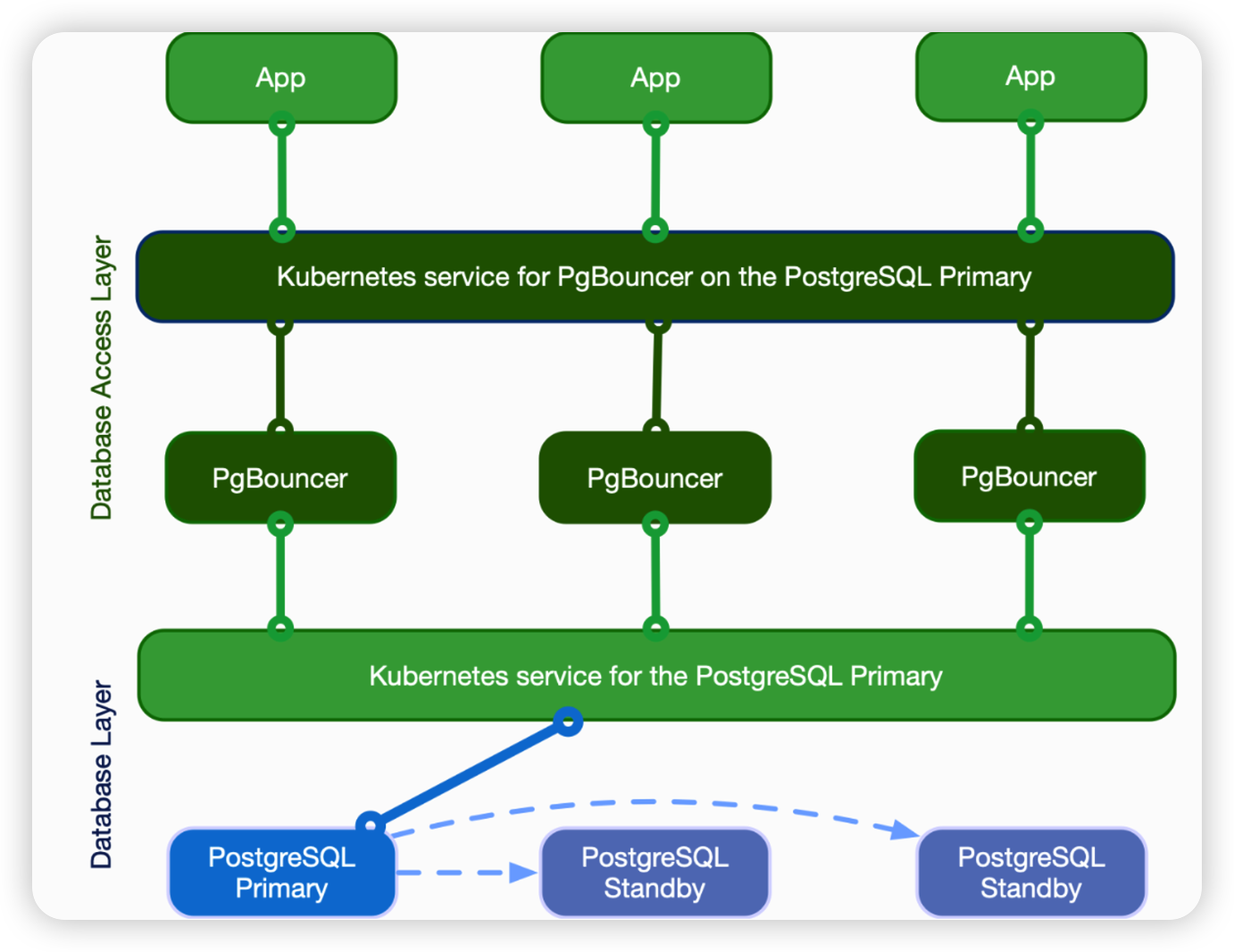 PgBouncer 기반으로 DB Access Layer 도입이 CloudNativePG 아키텍쳐를 어떻게 변경하는지 다음 그림으로 확인할 수 있다.