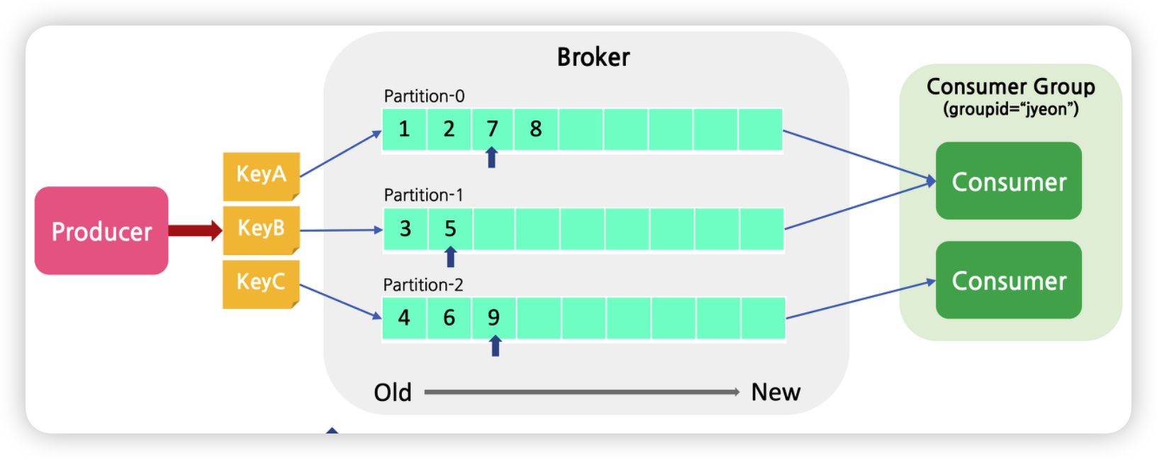 - 이를 Partitioning이라고 하는데 Partitioner(파티셔닝을 수행하는 주체)가 Message Key를 기준으로 어떤 Topic에 어떤 Partition으로 보낼 지 기준을 정할 수 있다.