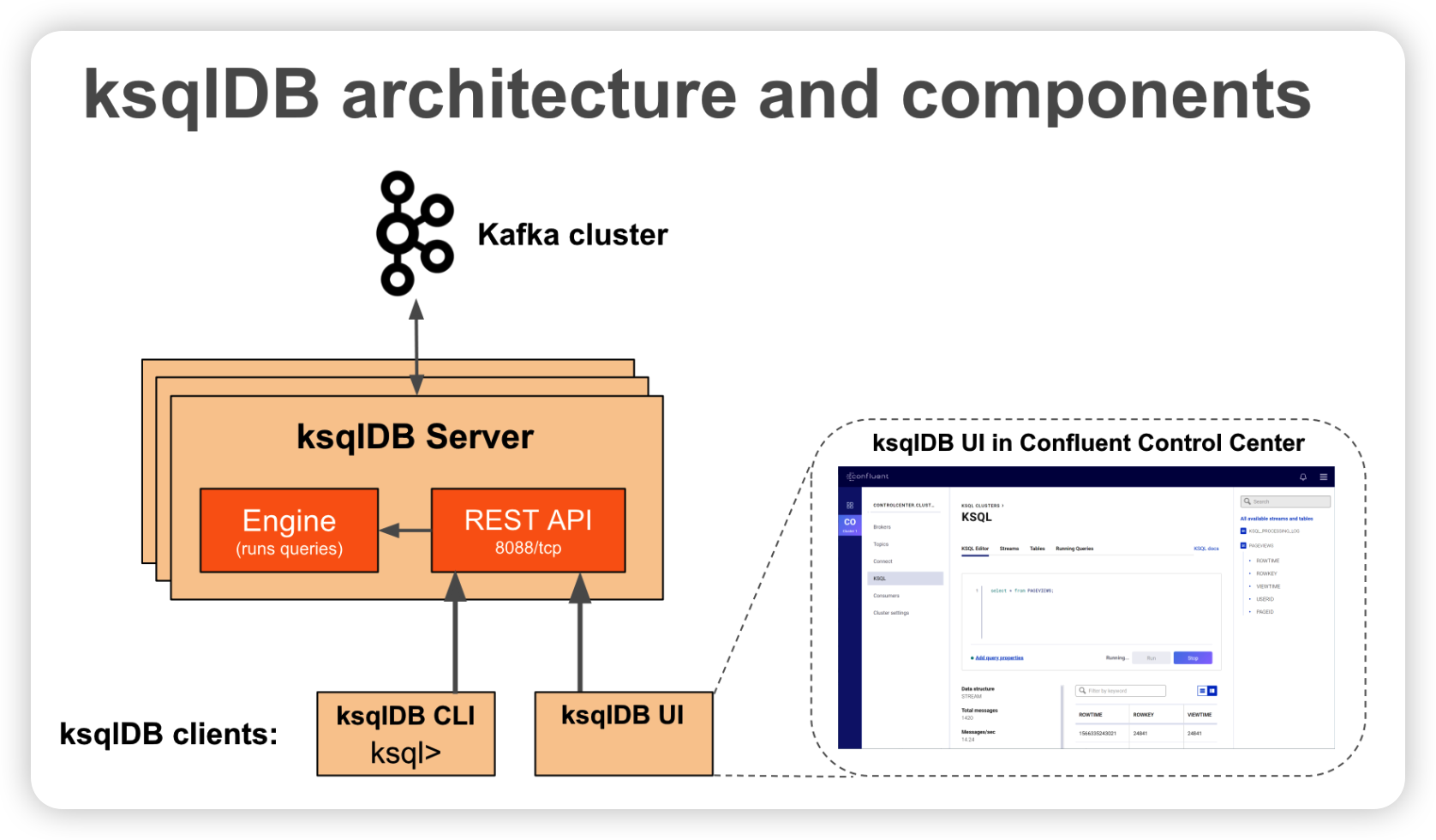 - KSQL Interface : KSQL Engine에 Client로 액세스할 수 있는 인터페이스 (CLI, UI, ..)