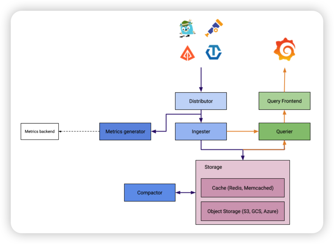 이런 역할을 수행하는 컴포넌트들은 Distributor, Ingester, Compactor, (Optional) Metrics Generator가 있다.